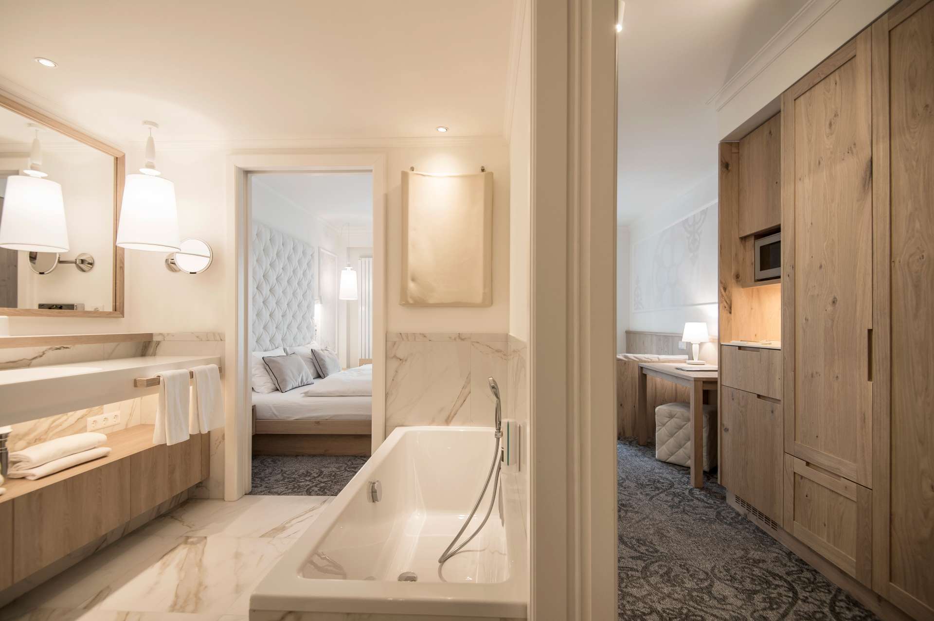 Stessa organizzazione degli interni della Family Smart Suite, ma più spaziosa. Zona notte matrimoniale, separabile dal resto dell’ambiente, con pareti scorrevoli. Zona living, con letto singolo o culla per neonato. Bagno, con doppio accesso, dotato di doccia, vasca e lavandino extra per bambini, progettato per essere utilizzato anche come vasca per bagnetto bebè. Suite disponibile anche con letto matrimoniale e culla estraibile e/o divano letto a castello e scrivania, al posto del letto singolo o culla per neonato.
